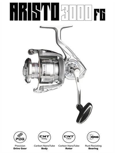 | ARISTO 3000FG | 5.2:1 | 8B+1RB | 10kg | 79cm | 0.16mm 150mt + 0.30mm 78mt | 252g |