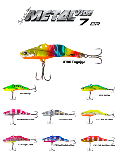 Fujin Metal Vibe farklı alanlarda geniş avlanma yelpazesi için 7, 10 ve 15 gram 3 farklı boyutta mevcuttur. Arttırılmış aksiyona sahip arka delik, akşam karanlığı ve çok bulanık sular gibi görme mesafesinin az olduğu zamanlarda daha iyidir.